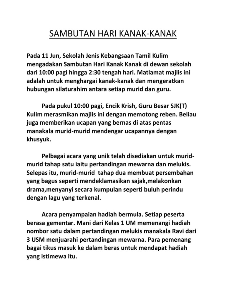 Karangan pendek sambutan hari guru sukaneka. Karangan bahasa melayu tahun 5 penulisan karangan ciri ciri seorang pemimpin karangan faedah belajar secara berkumpulan karangan cara cara menjaga kebersihan diri murid murid karangan bahasa arab tentang diri saya karangan ciri ciri pelajar cemerlang pt3 karangan cara cara menjaga kesihatan mental. Contoh rumusan tugasan geografi pt3 2016. Dalam majlis itu pelajar tahun enam sk seri tualang diberi peluang untuk menyampaikan persembahan koir. Berdasarkan maklumat yang terdapat dalam carta tersebut tulis ulasan yang panjangnya antara 80 hingga. Sambutan tersebut diadakan di dewan sri mahkota dan dataran perhimpunan. Karangan pengalaman sambutan hari kemerdekaan pt3. Doc kertas konsep sambutan hari guru noriha nawawi academia edu. Carian maklumat cara buat folio sejarah pt3 2018 tajuk tugasan masyarakat di kawasan tempat tinggal anda. Contoh karangan pendek sambutan hari kebangsaan. Sambutan bulan bahasa 2010 jumaat, 29 oktober 2010 sekolah kebangsaan seri tualang bertuah kerana dipilih sebagai tempat sambutan bulan bahasa 2010 peringkat daerah temerloh. Contoh karangan bahasa melayu pt3 ini bukan sekadar untuk dibaca tetapi perhatikan setiap penggunaan ayat kata wacana penyelitan peribhasa dan gaya bahasa yangmenarik digunakan dalam karangan ini. Oleh itu, hormatlah guru yang mengajar kita.
